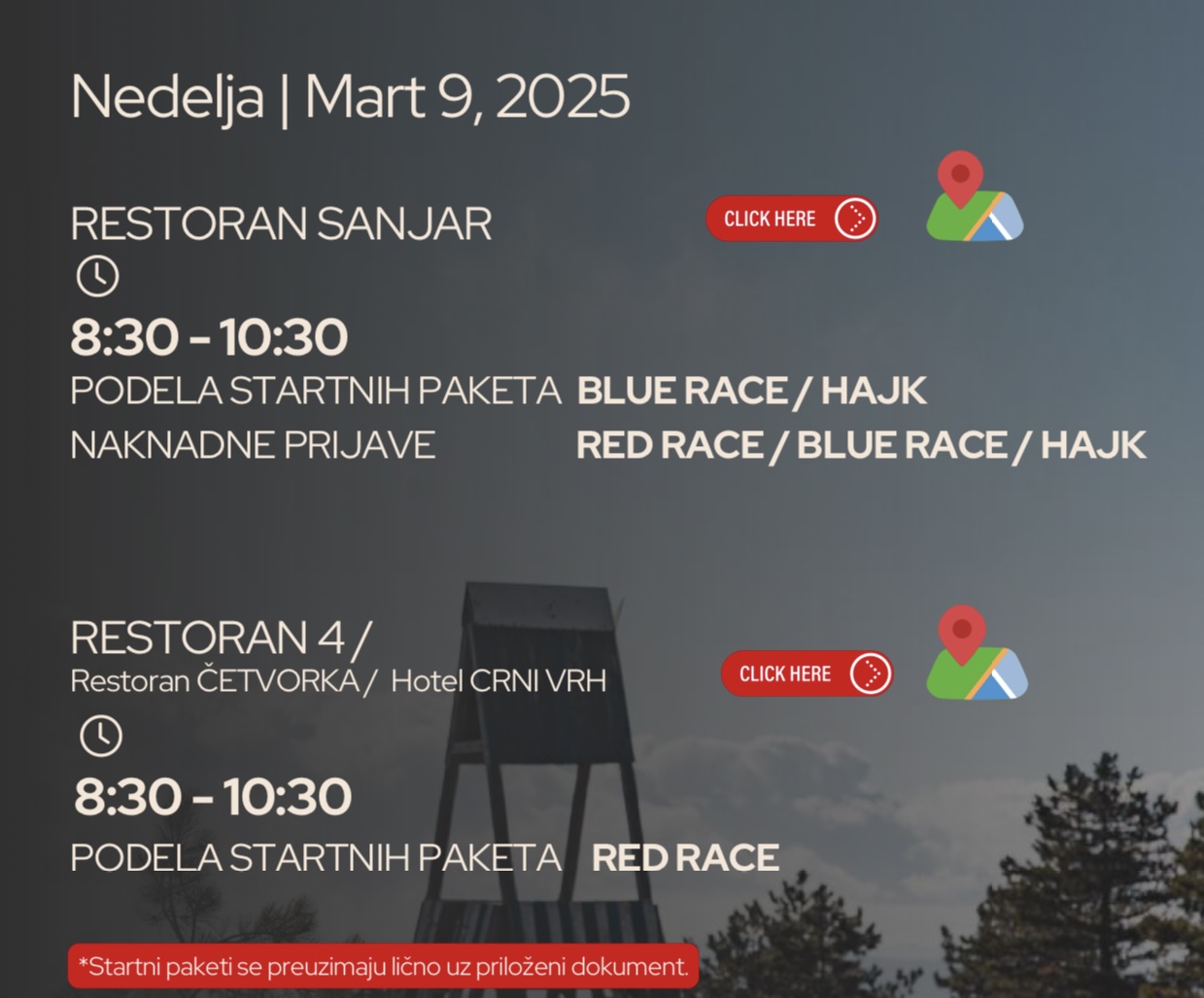 Startni brojevi za 5. Divča Winter Trail, koji će se održati 9. marta 2025. godine, preuzimaju se na dan trke u restoranu Sanjar i restoranu 4. Preuzimanje startnih paketa i naknadne prijave moguće su od 10:15 do 11:30 časova dok je start na stazu Crni vrh u 12h!